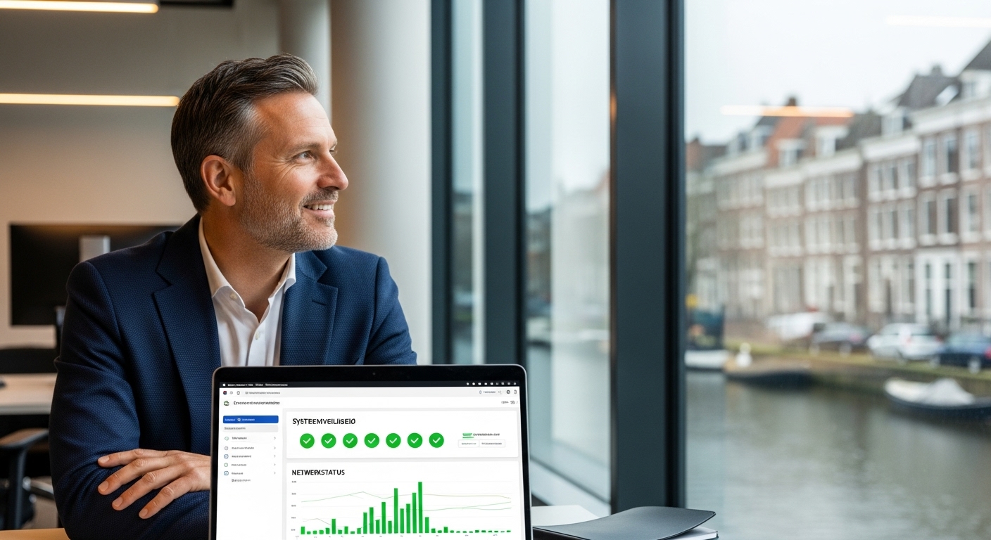 Maanden later zat Maarten weer op een dinsdagochtend op kantoor. De geur van koffie was hetzelfde, het gezoem van de computers ook. Toch was alles anders. De stilte was terug, maar het was een ander soort stilte. Het was niet langer de onwetende stilte van voor de storm, maar de kalme, zelfverzekerde stilte die voortkomt uit controle en zekerheid. Hij keek naar zijn verkoopcijfers, die nog steeds dansten op zijn scherm. Hij wist dat achter die cijfers een onzichtbaar team van experts waakte, dat zijn digitale fundament sterker was dan ooit. Zijn team werkte flexibel en veilig, of ze nu thuis waren of op kantoor. De angst voor de ‘wat als’-scenario’s had plaatsgemaakt voor het vertrouwen dat hij de juiste keuze had gemaakt. Hij kon zich weer volledig richten op waar hij goed in was: ondernemen. De investering in professionele IT-beveiliging was geen kostenpost gebleken, maar een investering in de meest waardevolle activa van zijn bedrijf: continuïteit en gemoedsrust.